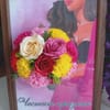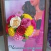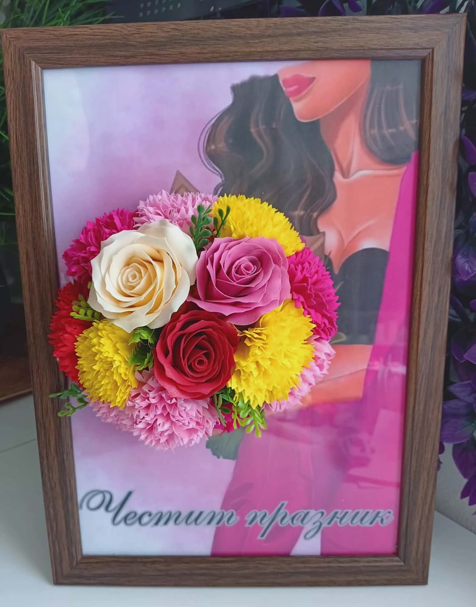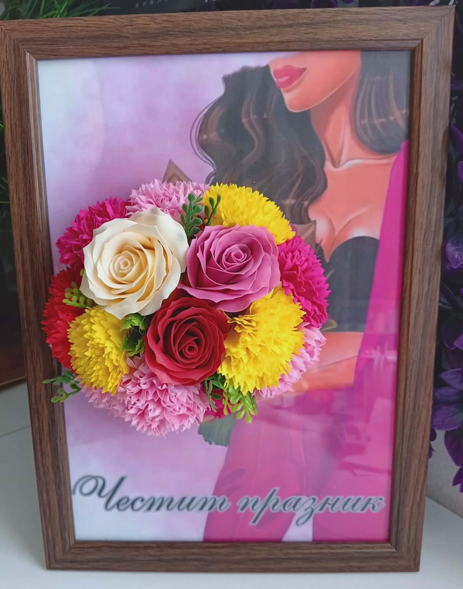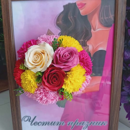 Букетът е представен в стилна рамка, която му придава завършен и луксозен вид, правейки го отличен подарък за специални поводи като сватби, годишнини или празници. За да направите подаръка още по-личен и уникален, имате възможност да добавите текст по избор – например, любимо послание, дата или имена, които ще придадат още повече емоционален заряд на подаръка.