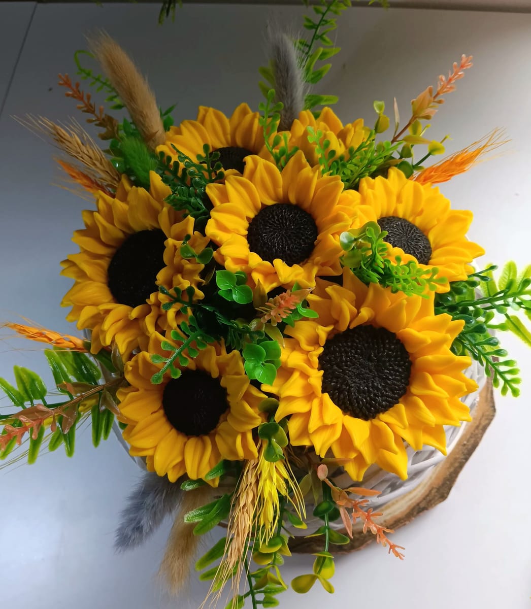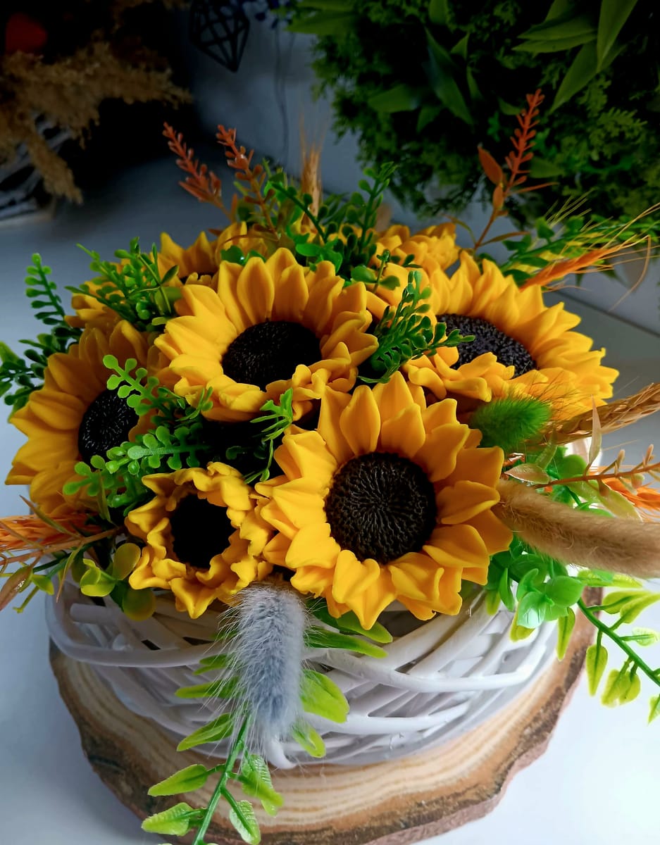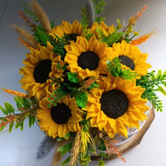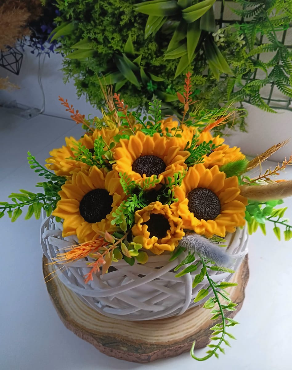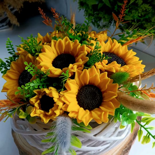 Начало / Продукти / Букет от глицеринов сапун / Букет в ратанова кашпа "Слънчогледи"